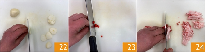 Slice it into not too thin pieces 22. Then, chop the chili pepper 23 and cut the bacon into strips 34.
