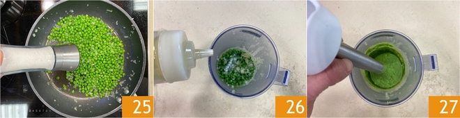 When the peas are tender, season with salt 25 and transfer everything to a mixer glass, adding a drizzle of oil 26. Blend the peas until you get a smooth and velvety cream 27; taste it and adjust the salt if necessary, then keep it warm.