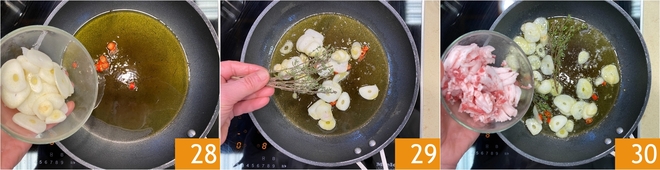 Put a pot full of salted water on the stove, which will be used for cooking the pici. In a large pan, heat another drizzle of extra virgin olive oil and add the chili pepper, garlic 28, a few sprigs of thyme 29, and the bacon cut into strips 30.