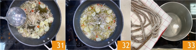 They will be ready when they rise to the surface. Drain them 34 and transfer them directly to the pan with the garlic and bacon dressing 35, add another ladle of cooking water 36 and sauté for a few minutes.