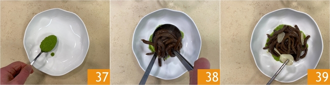 You are ready to serve: spread the pea sauce on the base of the plate, then place a nest of well-seasoned pici on top and add some slices of garlic and a bit of bacon 39.