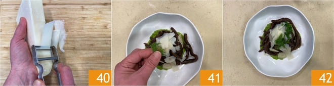 Using a vegetable peeler, create shavings of pecorino 40, add them to the plate and finish by decorating with fennel 41 and pea shoots for a fresh and fragrant touch. Serve the coffee pici with garlic, bacon, and peas immediately, piping hot 42.