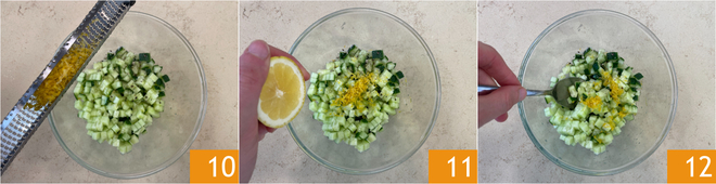 Continue with the lemon zest 10 and juice 11, mix 12, and let it rest until use.