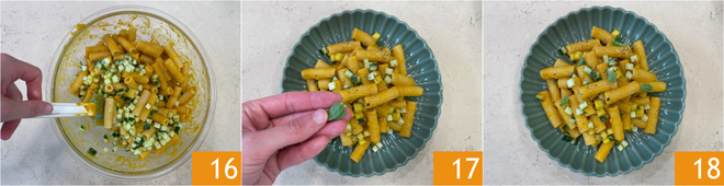 Cook the pasta in boiling salted water 13. Drain it into a bowl, add the carrot cream 14, and mix. Also, add the cucumbers 15, keeping some aside for plating.