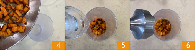 Transfer them to a container 4, add water 5, salt, and blend with an immersion blender 6 until a smooth and homogeneous cream is obtained and set aside.