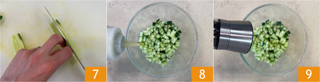 Clean the cucumbers and cut them first into sticks 7 and then into small cubes of 0.2 inches. Transfer them to a bowl and season with oil 8, salt, and pepper 9.
