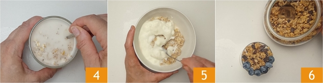 Mix well 4, then close with the lid and let it rest in the refrigerator overnight (or at least 6 hours). After resting, transfer the porridge to a bowl and garnish with soy yogurt 5, chocolate granola, and blueberries 6. Your cold porridge is ready to be enjoyed!