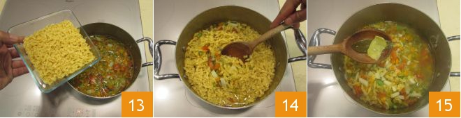 After this time, add the egg pasta directly into the pot 13, stir well 14, and cook for another 3 minutes, then turn off the heat, remove the bay leaf and lemon peel 15.