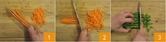 To prepare the cold vegetable soup, start with the prep work: peel and trim the carrots, then cut them into strips 1 and dice them 2. Wash and trim the green beans and cut them into slices 3.