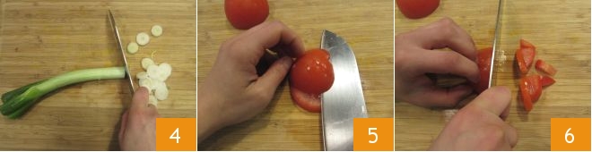 Wash the green onion, remove the root, and slice it lengthwise, using the lighter part 4. Wash the tomato, remove the green part, and slice it 5, then halve each slice and cut into quarters 6.