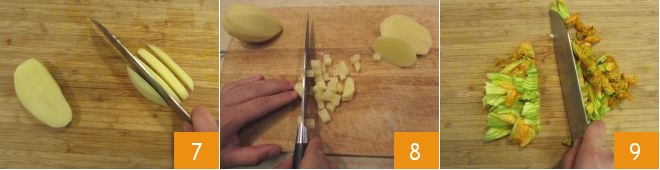 Wash and peel the potatoes, halve them, cut into sticks 7, and finally dice them 8. Lastly, gently wash the squash blossoms, remove the internal pistil, and chop them roughly 9.