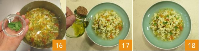 Add the fresh oregano 16 and let everything cool in the pot so the pasta can continue cooking with the heat of the soup. Once lukewarm, transfer the soup to the plates and season with a drizzle of raw olive oil 17 and a grind of black pepper: your cold vegetable soup is ready to be served 18!