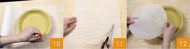 Place the pan on parchment paper and draw the circumference of the pan with a pencil 10, then cut it out 11 and place the resulting circle inside the pan 12