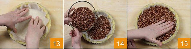and arrange it to cover the sides as well 13. Then place the dried legumes inside 14 and press them well into the pan 15: the beans should reach the edges to evenly distribute the oven's heat across the entire surface.
