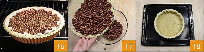 Then bake the pastry for about 15-20 minutes in a preheated oven at 392°F 16. Remove it from the oven, and take out the legumes and parchment paper 17. At this point, the edges will be nicely golden but not the bottom 18. Bake again for 10-15 minutes at the same temperature so that the pastry dries out and becomes golden.