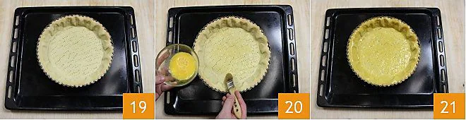 Remove the base from the oven 19 and brush it with beaten egg on the base to isolate the filling (20-21). Return it to the hot oven for a couple of minutes, so the egg forms a sealing layer. Now your base is ready to be filled with pastry cream or jam!