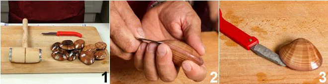 To clean and use fasolari, you will need a knife with a rounded tip and a thin blade and a kitchen meat tenderizing mallet. There are two types of fasolari: one with a lighter shell and one with a darker shell: however, the taste and texture of the meat are the same 1. To correctly clean fasolari, it is necessary to open them by cutting the two internal lateral muscles. Hold them, taking care to place the shorter part of the shell facing downwards in the palm of your hand 2. Insert the blade between the two shells, helping yourself with finger pressure. Insert the flat tip of the knife all the way in 3 and