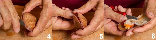 slide it sideways, taking care to keep the blade inclined upwards 4. Slightly force the shell to open it, turn the blade, and cut the other lateral muscle (5-6).