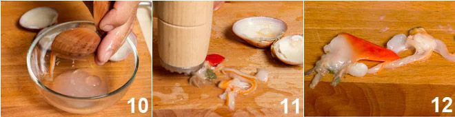If you want to use it cooked, instead, after collecting the mollusk's liquid in a small bowl 10, extract the fruit from the shell and place it on a cutting board. With the help of a meat tenderizing mallet like this, soften the fasolaro's meat, focusing on the red foot, until it becomes thin, intact, and tender (11-12).