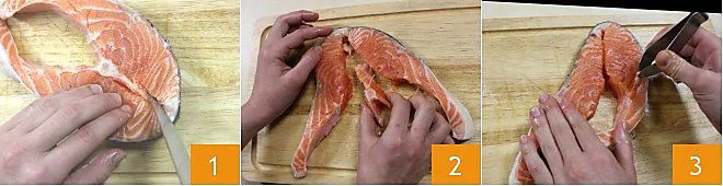 To prepare the fish medallions, you need fillets about 1-1.5 inches thick; in our case, we've used salmon. First, remove the central bone: make two cuts on either side of the bone with the tip of a knife 1, remove the bone with your hands 2, then, using tweezers, remove any remaining bones in the flesh 3. Since not all bones are visible, it's useful to run your hand over the salmon to find them and easily remove them with tweezers.