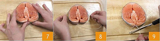 and shape the flesh with your hands to achieve a rounded form 7. To ensure this shape is maintained during cooking, it's essential to secure each medallion with kitchen string: place the string snugly around the perimeter of the medallion, as shown in the photo 8, then make a tight knot and cut off the excess string with kitchen scissors 9. Your salmon medallion is ready to be used! Once the fish medallion is cooked, remove the string with kitchen scissors and serve it at the table.