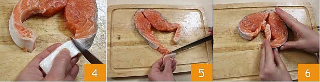 Remove the skin along the outer lateral edges of your salmon slice by making an incision with the tip of a knife at a height of about 2 to 2.5 inches 4, then proceed horizontally with the blade to remove all the skin 5; be careful not to waste too much flesh during this operation. Now fold the skinless lateral edges of flesh inwards 6,