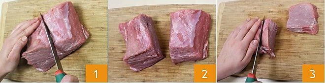 To prepare meat medallions, you should have a cut of boneless meat, either beef or pork; round and tenderloin are particularly suitable, and we've chosen to use veal round. Typically, medallions are about 2.75 inches in diameter and about 1-1.5 inches thick; if you have a large piece of meat, it's advisable to cut it in half (1-2), making it easier to obtain smaller and more regular slices. Once this is done, cut your veal pulp into slices about 1-1.5 inches thick 3. If you chose to use tenderloin, it is recommended to cut slices at least 2 to 2.5 inches thick. At this point, each medallion needs to be secured with kitchen string: pass the string around the entire perimeter of the meat slice and secure it with a very tight knot to maintain the shape during cooking.