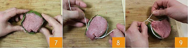 Alternatively, you can also flavor the meat with bay leaves: place 4 bay leaves along the perimeter of the meat slice 7, then secure everything with kitchen string by making a double loop to ensure the bay leaves are well fastened 8 and close with a double knot 9. Once your meat medallions are cooked, remove the string with kitchen scissors and serve them on the table, perhaps drizzling them with the gravy obtained during cooking.