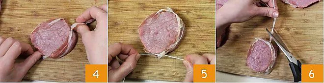 To make your recipes more appetizing, you can flavor the meat with bacon or bay leaves; here's how to proceed: wrap each beef medallion with bacon 4 and secure everything with kitchen string by making a tight knot 5, then cut off the excess string with scissors 6.