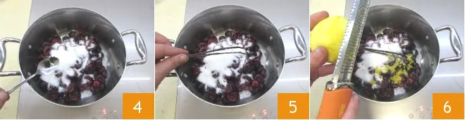 Add the vanilla pulp 4 and also the emptied pod 5. Grate the lemon zest into the saucepan 6.