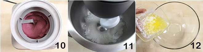 When the mixture has reached the indicated temperature, cool it quickly in a blast chiller or transfer it to a pitcher 7 and place it in a bowl full of ice to cool it quickly, then cover with plastic wrap and place the pitcher in the freezer: the mixture should become very cold. When both the grapes and the cream mixture have cooled sufficiently, combine them using a whisk 8, then transfer everything to an ice cream maker 9 (the ice cream maker's bowl should be very cold, we recommend putting it in the freezer at least the night before).