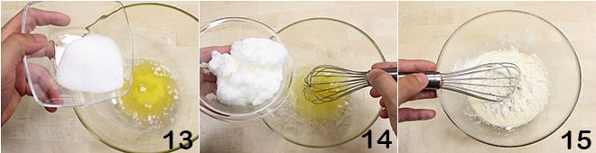 Add the sugar to the butter 13 and mix with a whisk to combine the ingredients; you should obtain a smooth mixture without lumps. Continuing to mix, incorporate the egg white 14 and sifted flour 15: you should obtain a smooth mixture without lumps.