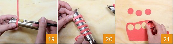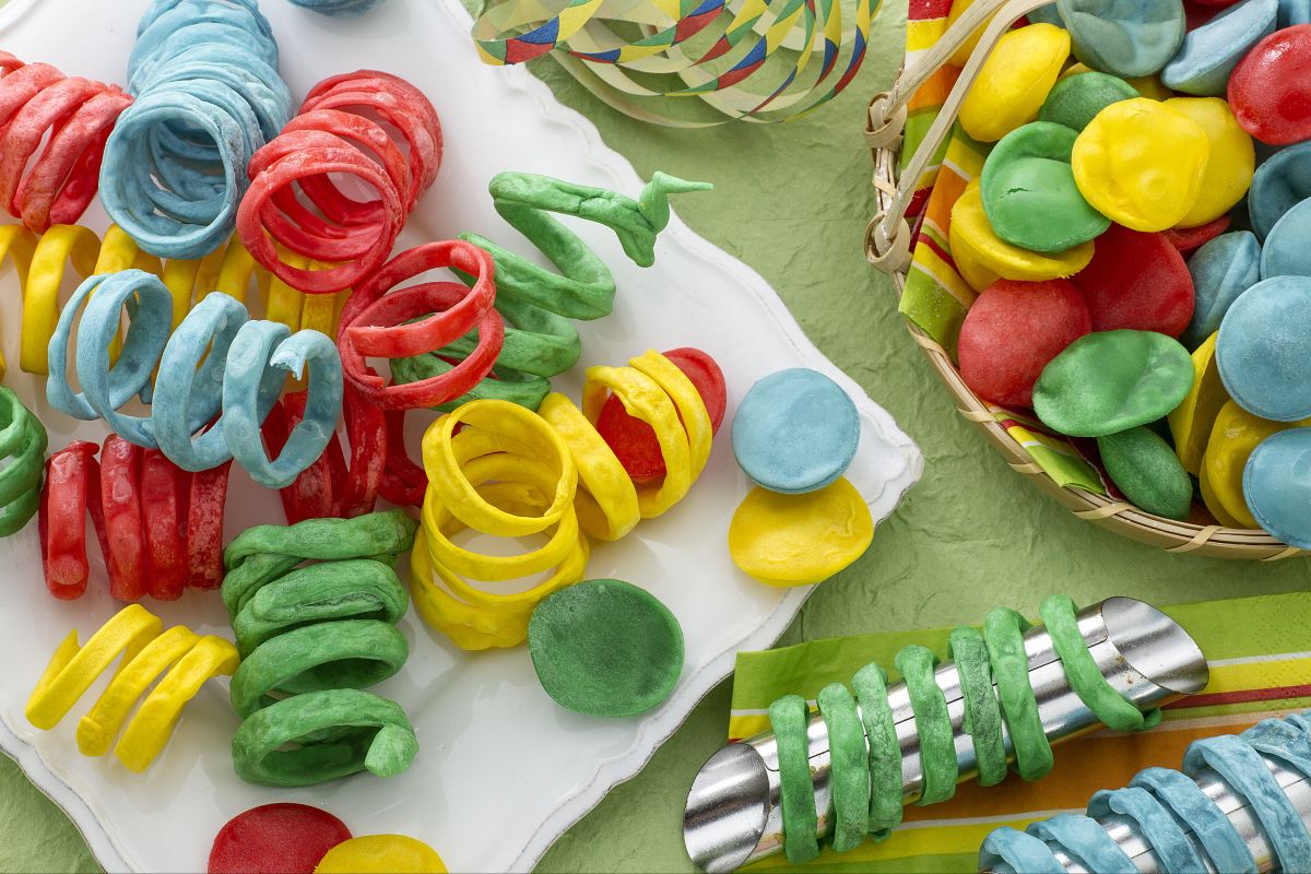 Wrap a strip of dough around the cylinder, brush the first turn of dough with egg white, and wrap another turn of strip on top. In this way, you will secure your streamer well 19, but be careful not to brush the cylinder with egg white, otherwise, the streamers will not detach from the dough. Wrap the remaining strip around the cylinder and secure it at the end with a double turn fixed with egg white, as done before 20. The streamers will thus have the typical spiral shape! Then proceed by rolling out the second part of colored dough, always obtaining a sheet with a thickness of 1 mm, from which you will cut out, with a small round cutter (diameter 1.2 inches), circles, i.e., your confetti 21. Re-knead the dough scraps and cut out more confetti.