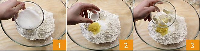 To prepare the confetti and streamers, start by making the basic dough: in a bowl (or in the bowl of a stand mixer fitted with a paddle attachment, at medium speed) pour in the all-purpose flour, make a well in the center and add the sugar 1, then the grated zest of an untreated lemon, the vanilla extract, and the salt 2. Also add the softened butter at room temperature 3 then crack the eggs into another bowl,
