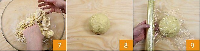 Knead everything with your hands 7, until you obtain a smooth, homogeneous and compact mixture 8 that you will cover with plastic wrap and let rest in a cool place (but not in the refrigerator) for at least 30 minutes 9.