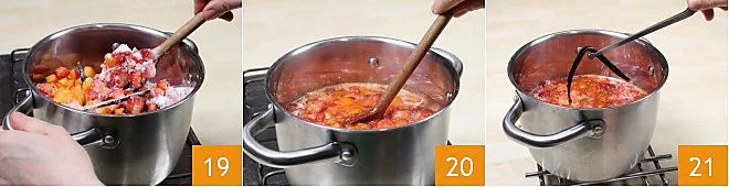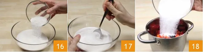 In a bowl, place 1.5 cups of granulated sugar and add the 3:1 mix 16, then stir the two ingredients with a spoon 17. Add the sugar mixture to the fruit in the pot, directly 18,