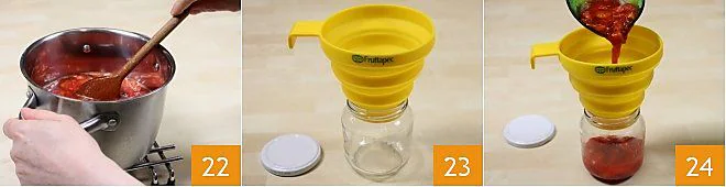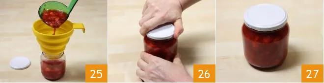 and continue until the jars are filled, taking care to leave about half an inch from the rim 25, then with the appropriate lids, close them 26, tightening well and ensuring they are hermetically sealed. With the heat of the jam, a vacuum will form, allowing the product to be stored for a long time. Once the jars have cooled, check if the vacuum has been achieved: you can press the center of the lid, and if you don't hear the usual "click-clack" sound, the vacuum is present. Your strawberry and apricot jam with vanilla is ready 27.