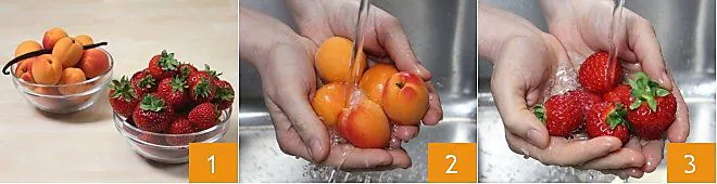 To prepare the strawberry and apricot jam with vanilla 1, start by washing the apricots and strawberries under running water (2-3).