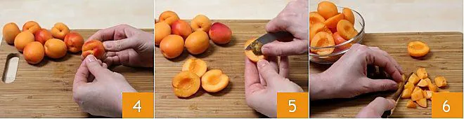 Detach the apricots' stems with your fingers 4, then remove the pit by splitting the apricots in half with a small knife 5; finally, cut the apricots into small pieces 6.