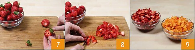 Trim the strawberries, removing the stems 7 and cut them into small pieces as well 8. Gather the fruit pieces in two bowls 9.