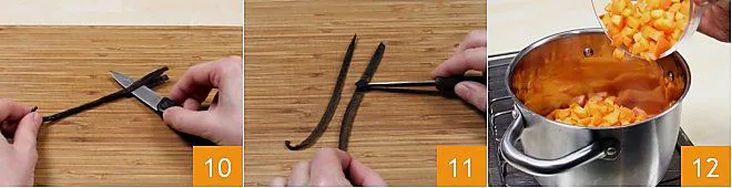 Cut a vanilla bean lengthwise 10 and use the tip of a small knife to extract the seeds 11. Alternatively, you can use a packet of vanillin or a teaspoon of vanilla extract. In a tall and spacious stainless steel pot, pour in the apricot pieces 12 and