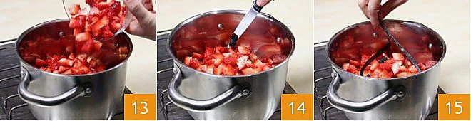 the strawberry pieces 13. Add the vanilla seeds to the fruit in the pot 14 along with the cut bean 15; the vanilla will give the jam a more intense flavor. These operations should be done with the heat off.