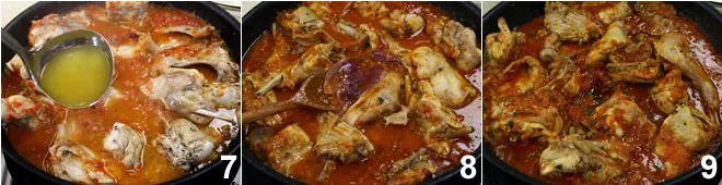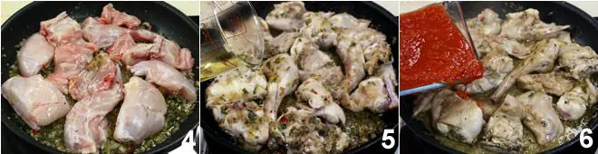 then add the rabbit pieces and let them brown 4. Add the white wine 5 and let it evaporate, then add the tomato 6, salt and pepper, and cover with a lid.