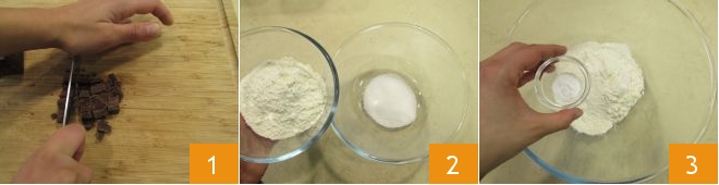 To prepare the cookies without butter, first make the coffee with a moka pot and let it cool; you should make it fairly strong. Coarsely chop the dark chocolate 1 and set it aside. At this point pour the sugar into a bowl along with the flour 2 and the baking soda 3.