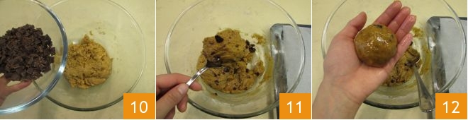 At this point add the chocolate pieces 10 and incorporate them into the dough using a spoon. Then, still using the spoon, take about 2.5 oz (70 g) of dough 11 and shape it into a ball with your hands 12, then place it on a baking sheet lined with parchment paper. With these quantities you will get about 10 cookies without butter.