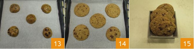 Continue in this way, spacing the portions of dough 13 apart; we recommend making 2 baking batches so you can bake 5 cookies at a time (you can leave the remaining raw cookies at room temperature while you wait for the second batch). Bake in a preheated conventional oven at 356°F for about 18 minutes. Then remove the cookies from the oven 14 and let them cool completely before transferring them to a tray, because they will still be soft. Once cooled, your cookies without butter are ready to be served 15!