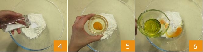 Add the salt 4, the egg 5 and the extra virgin olive oil 6.
