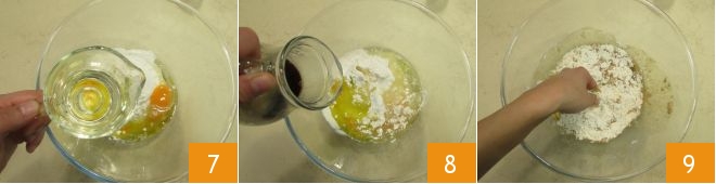 Finally pour in the vegetable oil 7 and the coffee, now warm 8. Work everything with your hands 9 or with a wooden spoon; you will obtain a mixture with a soft consistency.