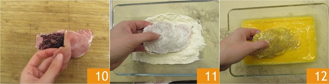 Cover with more radicchio, place another slice of loin on top 10, pressing the edges together well. Bread the cordon bleu by first passing it in the flour 11, then in the beaten egg 12.