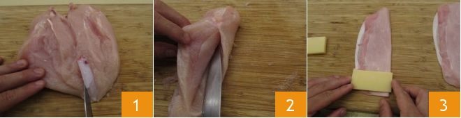 To make the cordon bleu, cut the whole chicken breast in half 1 and trim away any fatty parts. Take one half of the chicken breast and make a side incision to form a pocket 2, trying to leave three of the four sides attached; if you cannot manage that, leave at least the longest side intact. Place a slice of ham and top it with a piece of Gruyère 3